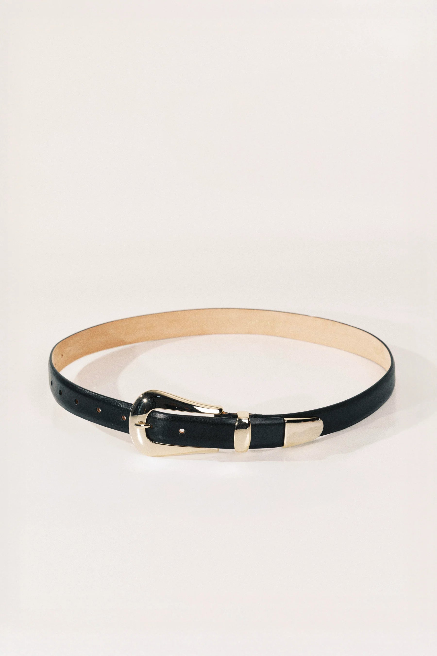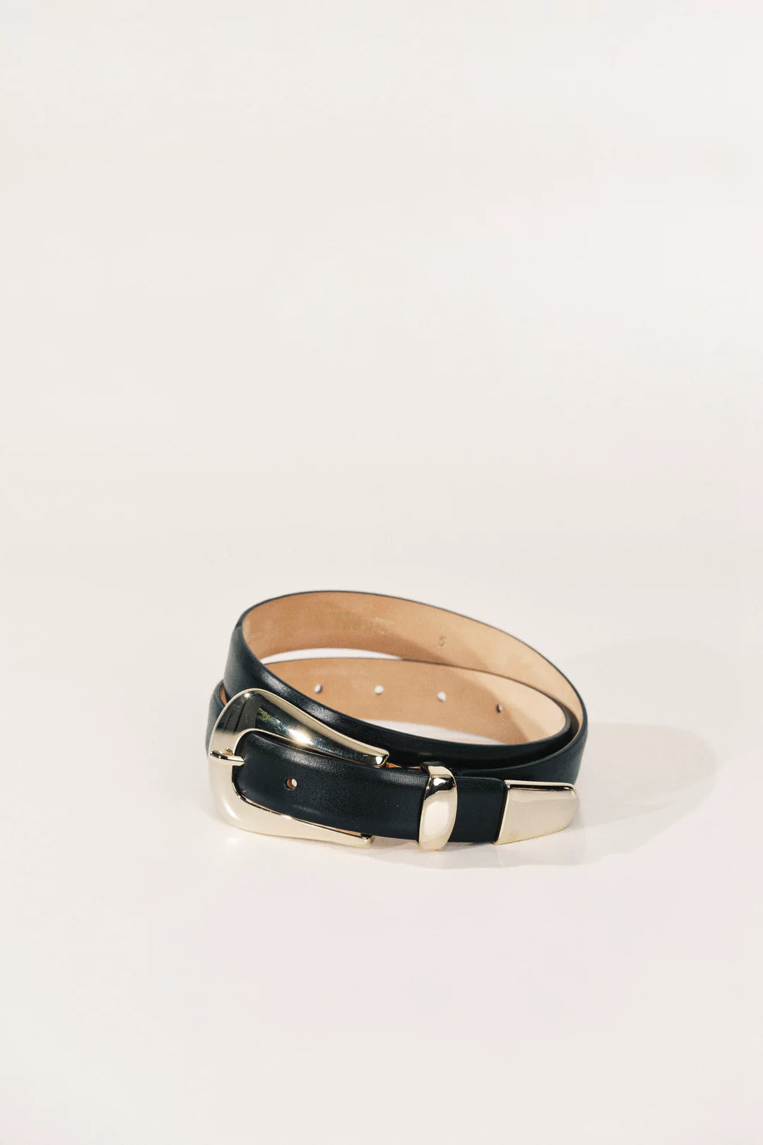 The Colette belt softens Western cues into a sculptural, minimalist accent, with pale gold oval hardware and Italian leather that sharpens the silhouette with quiet elegance.