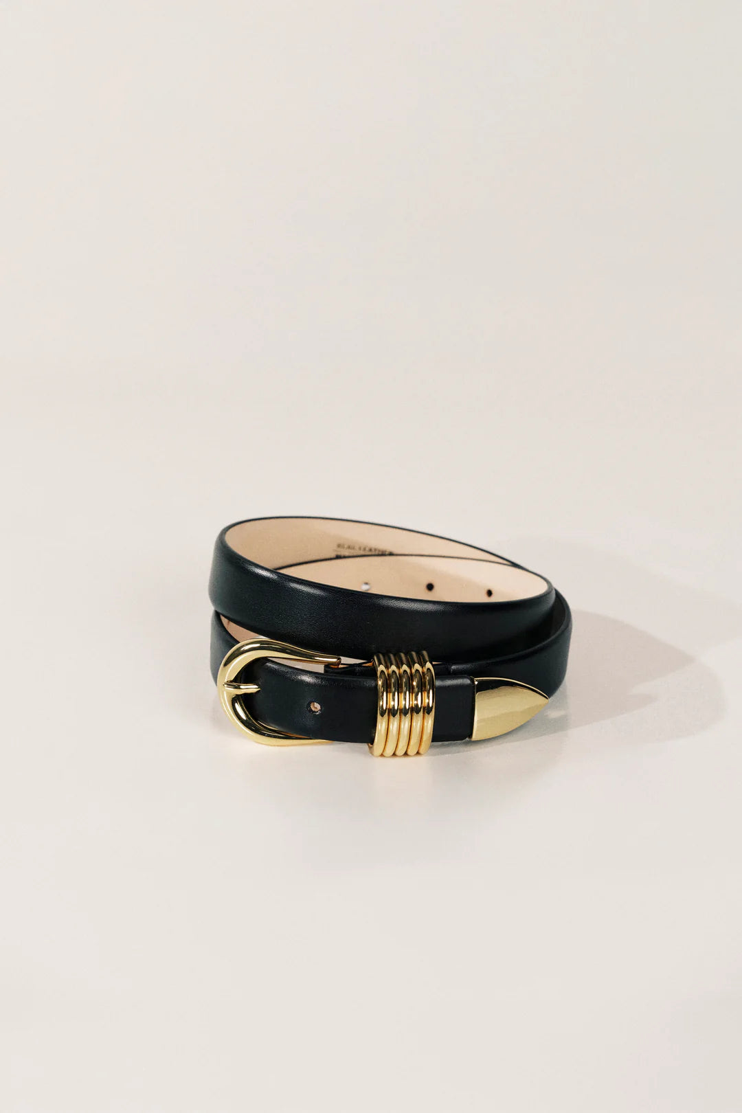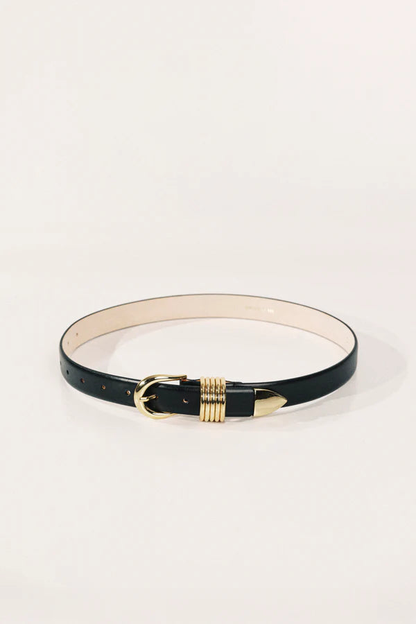 Déhanche's signature style featuring 5 rings adornments with 10 holes and an extended strap length to accommodate a broader range of sizes. Meticulously crafted from Italian leather and 24K gold hardware