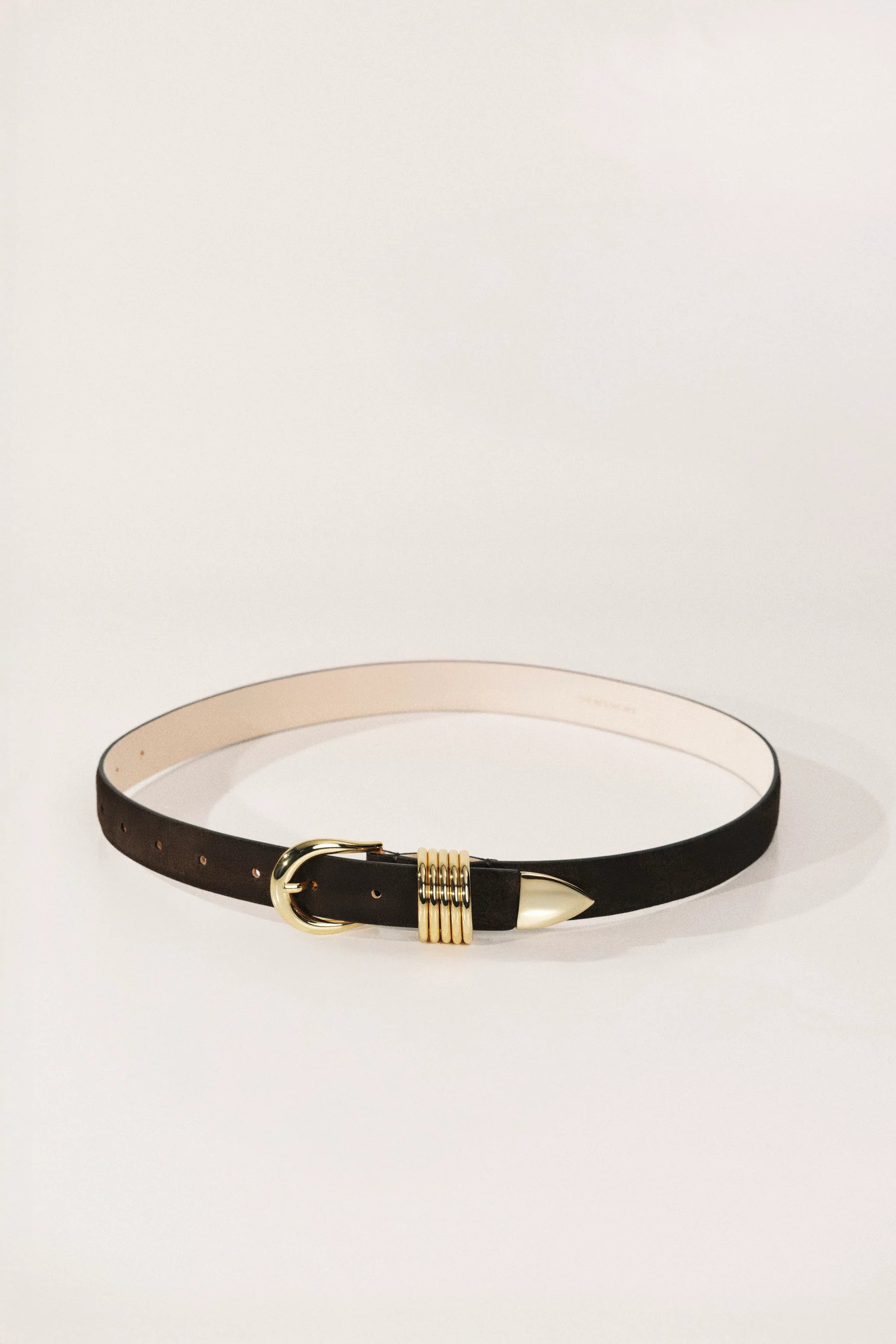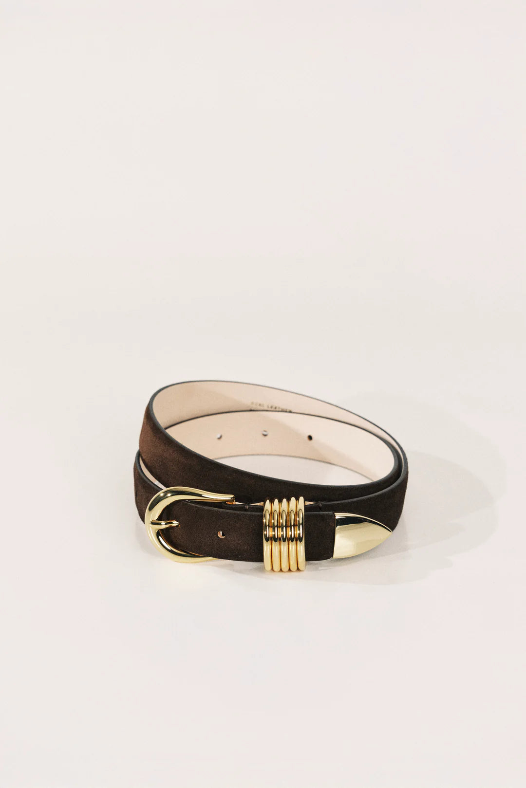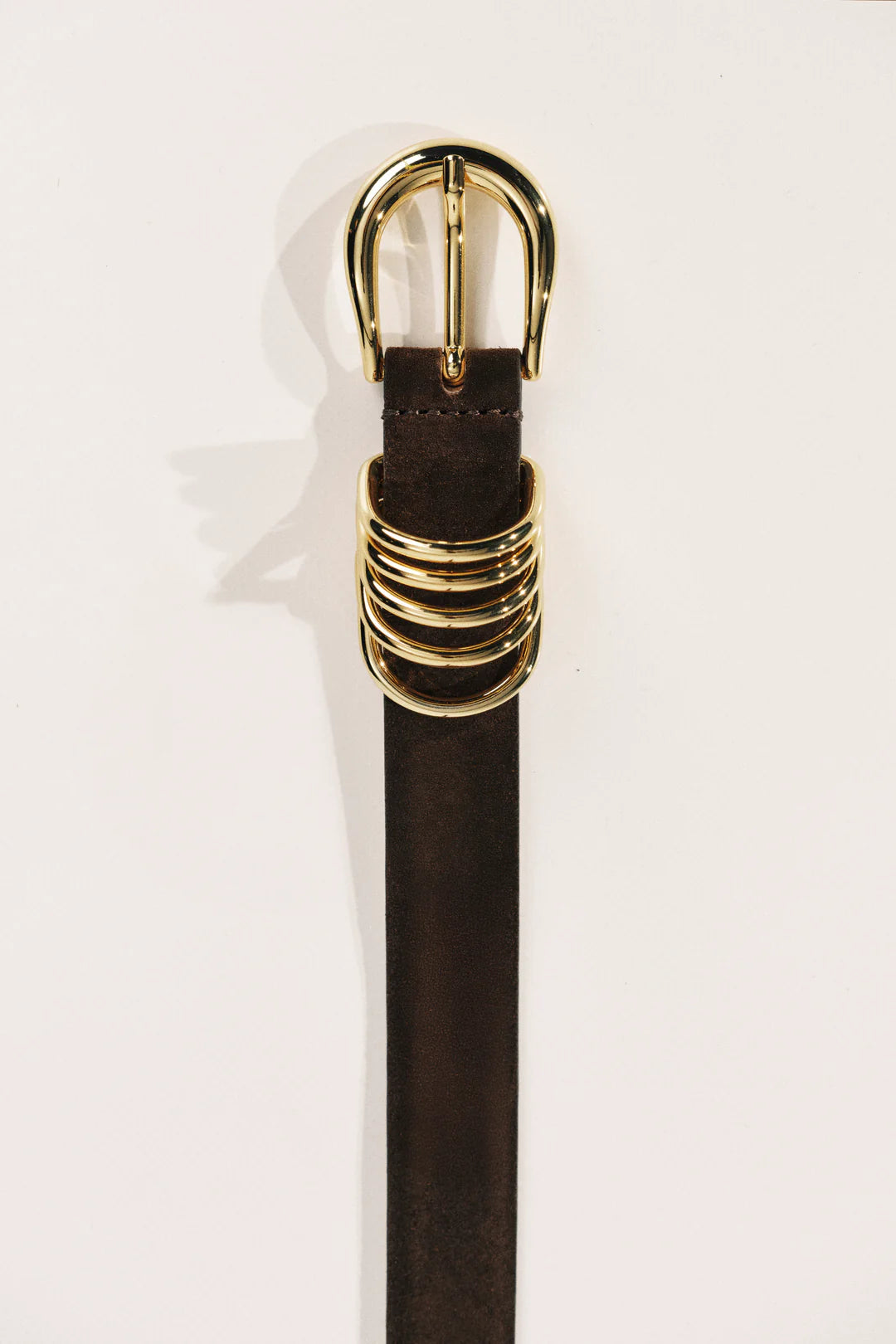 Déhanche's signature style featuring 5 rings adornments with 10 holes and an extended strap length to accommodate a broader range of sizes. Meticulously crafted from Italian suede and 24K gold hardware