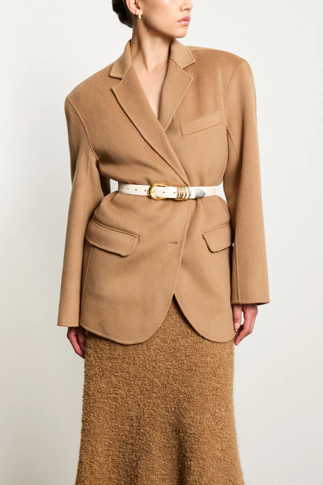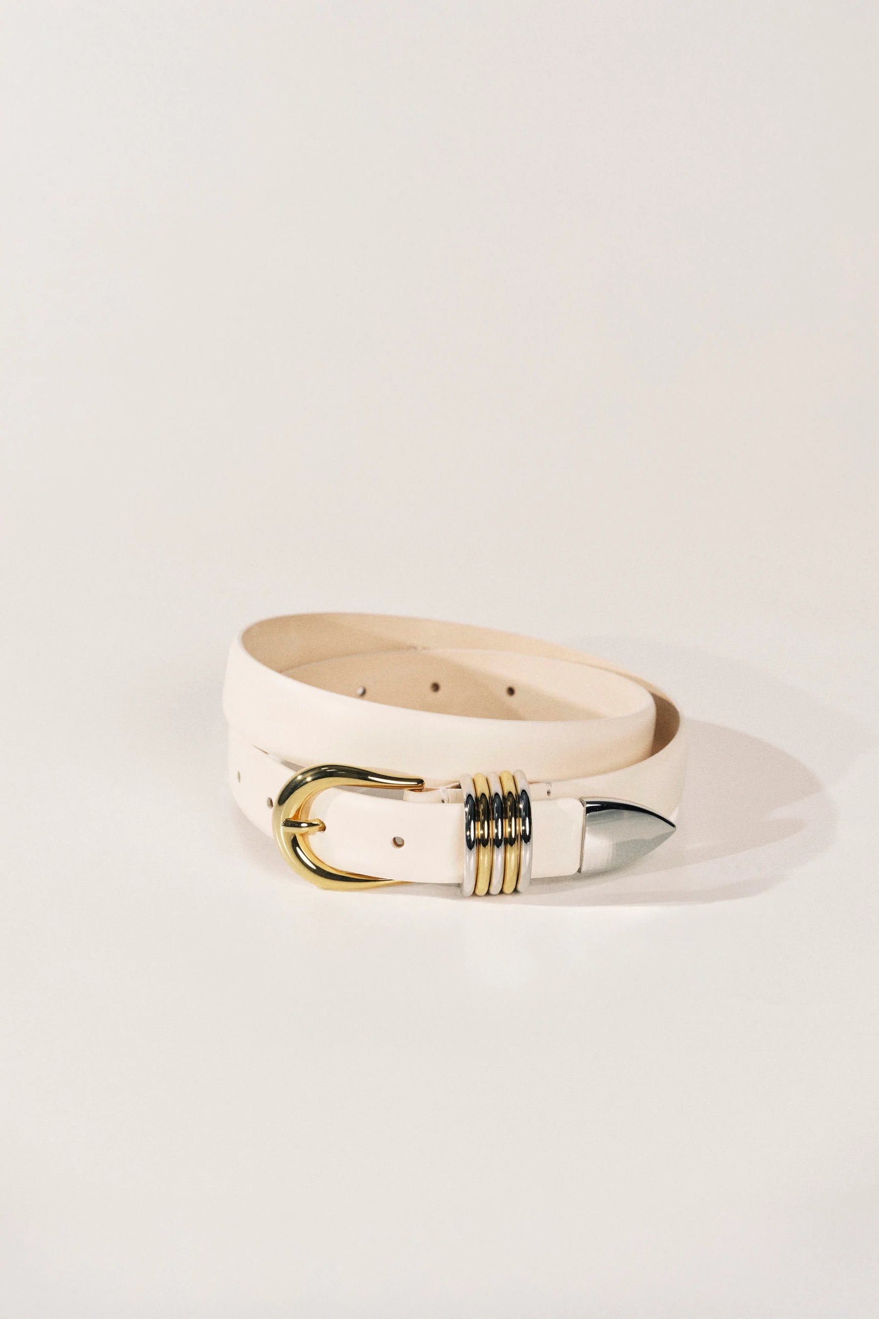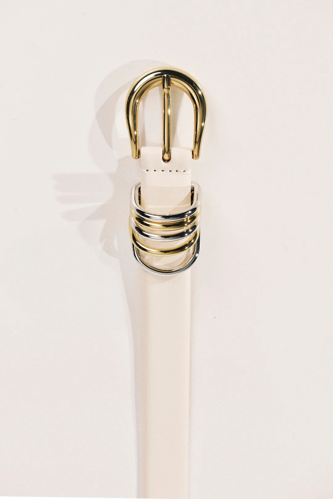 Déhanche's signature style featuring 5 rings adornments with 10 holes and an extended strap length to accommodate a broader range of sizes. Meticulously crafted from Italian leather and silver & 24K gold hardware.
